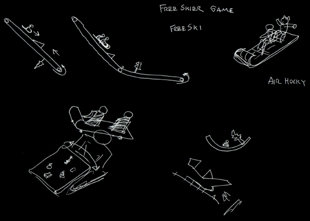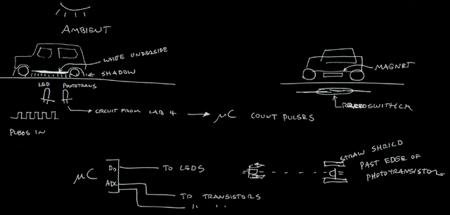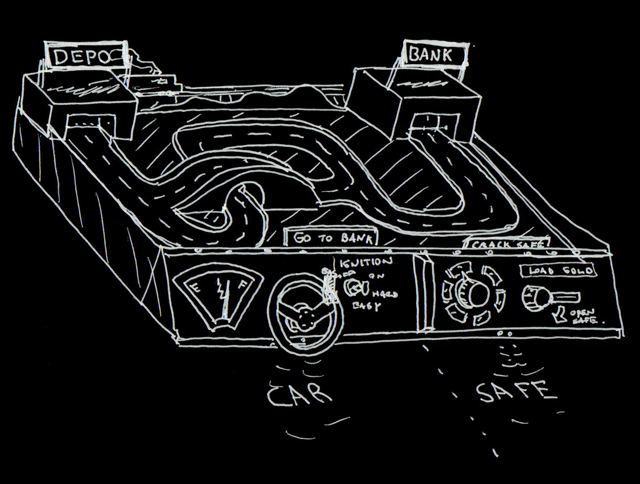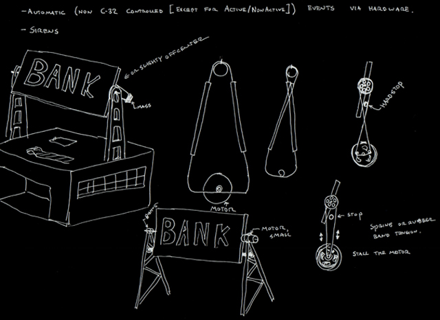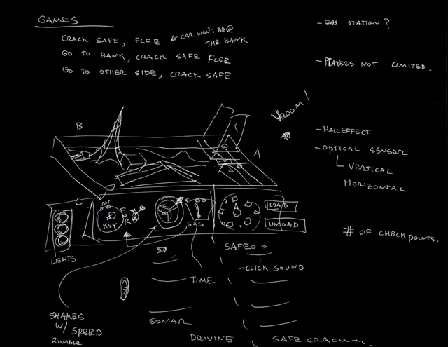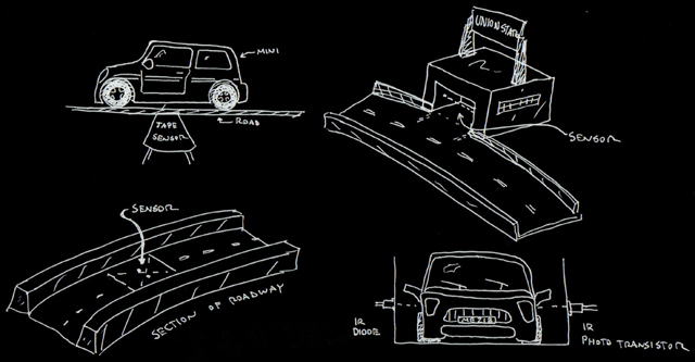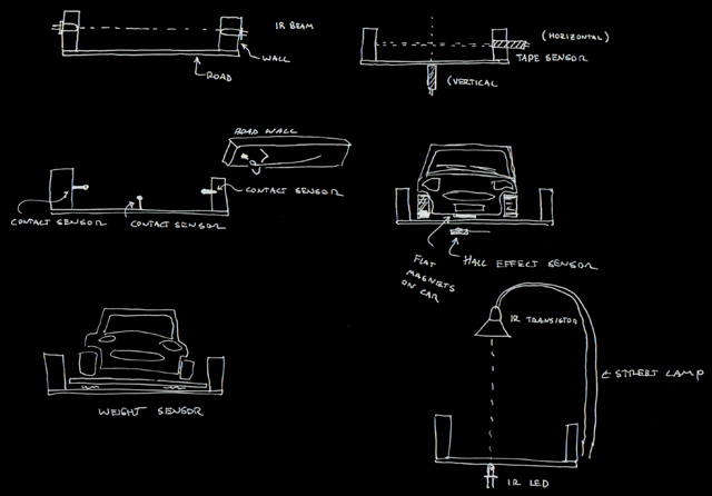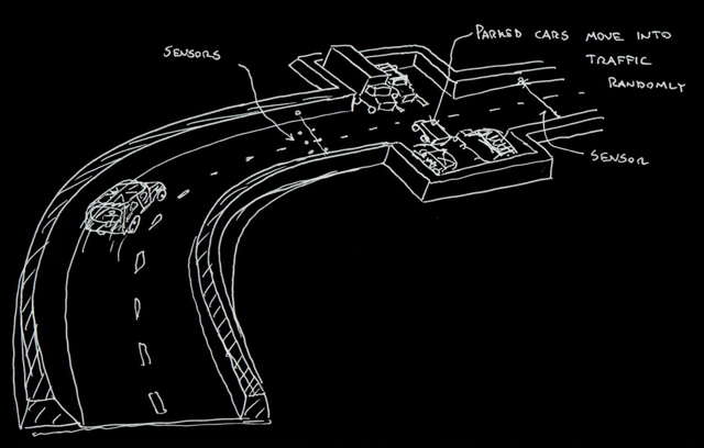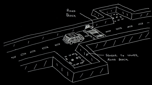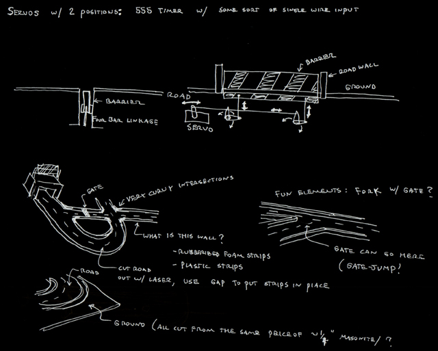 | Our initial concepts for the board were far more excessive than what we ended up creating. Initially, we wanted rising and falling blockades, cars that pulled out of driveways when a sensor was triggered, and a rotating disk with obstacles that had to be avoided on it. And these were our ideas after an initial simplification! |