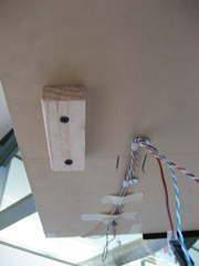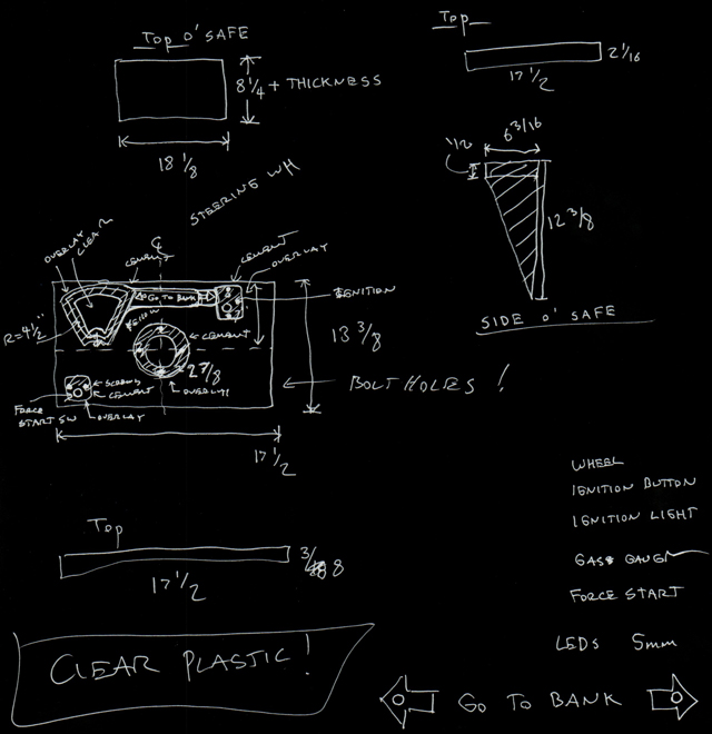 This plywood framed, Acrylic clad, behemoth of a box, contained the electrical systems of our flicker, and supported the driving scene, steering wheel and safe. The safe area was integrated into the plywood box, under the driving scene. |