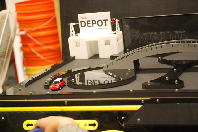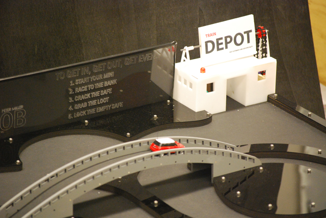 Our 1:56 scale Remote Control Mini Cooper needed a 1:56 scale environment to drive around in. Restricted to 24” by 36” for the absolute board dimensions, we were faced with a substantial challenge to make the board fun, fast, and challenging. We measured the turning radius of the RC Mini Cooper (6.5 inches) and designed all the road curves to match that radius, to better maintain the car’s speed through the course. |