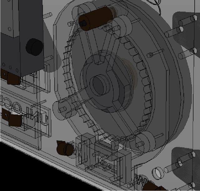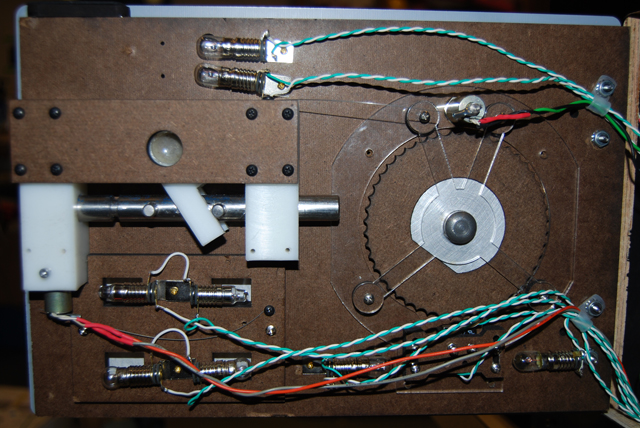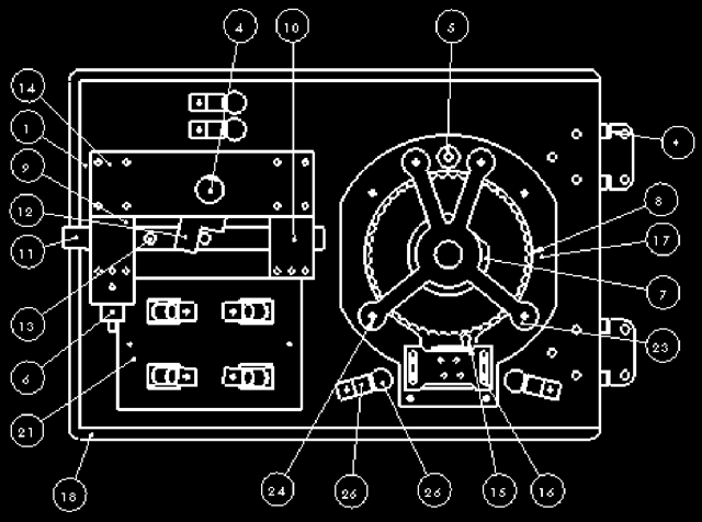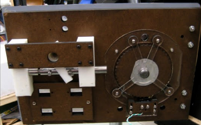 - A cam wheel guard (17) was constructed to protect the fragile Masonite cams; this piece was also designed as a mount for a small solenoid (5). The axis of this solenoid would run normal to the rear face of the dial, and when fire, the solenoid ram would strike the dial, resulting in a small vibration and a high-pitched ring that would indicate to the place that he reached the target ticks for this stage of the safe cracking operation. The cam guard was to be made out of acrylic due to its strength over Masonite.Finally, a cross-member (23) was erected to support the far side of the dial axle shaft.