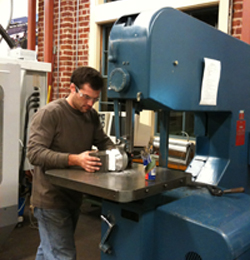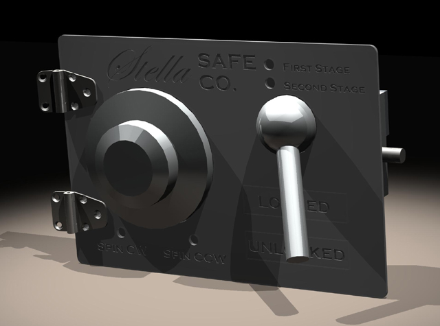| Because so little time was given to complete the project, we decided to forgo prototyping of most safe assemblies and instead base our decisions on what information was garnered from the CAD models. However, to ensure a proper sense of scale and a proper feel for the user, the safe dial and lock lever were machined without the use of engineering drawings or even sketches. First, a piece of 5”-diameter aluminum round stock was turned down to size on a lathe until a proper feel was achieved; the lock lever was then machined to the same scale as the dial. |