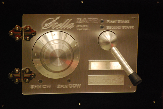 - The acrylic sheet for the safe fascia was sourced before the safe design was completed; it was clear with an aluminum-like veneer on one side. The fascia was designed to be etched with a laser cutter, then the aluminum veneer at indicator locations would be subsequently machined away.