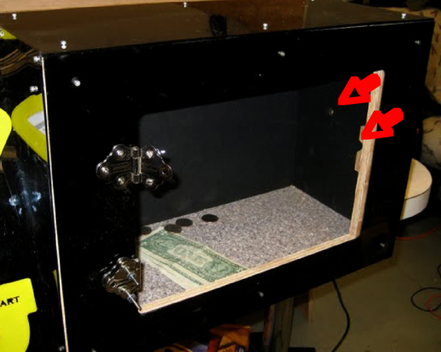 | The safe door was installed in the main box assembly by mounting it on a pair of small steel hinges. A piece of faux granite was placed in the bottom of the safe module it was then lined in heavy black matte board. Another small limit switch was placed in the upper right corner of the safe door opening; the switch is used to monitor the state of the safe door. A formed wood piece was placed in line with the safe bolt to guide it into place when locking the safe door. Finally, a phototransistor was placed opposite an IR LED inside the safe; this allows the microcontroller to monitor if the safe has been entered. |