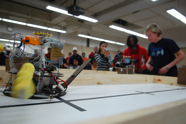 We realized that other robots employed the same strategy for getting points, but these robots were faster than ours. We would not win by hitting the bumpers alone. We did not have the time to construct a viable shooting mechanism, but we needed a method of scoring more points using the Nerf balls. At the last minute we added two music wire antennae with balls strung through them. The antennae would be tucked in underneath the arms, when the arms are released so are the antennae. These antennae would extend over the middle wall and contact the opposing robot when it passes by. This would potentially allow us to get extra points and defeat the opponent. |