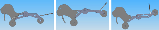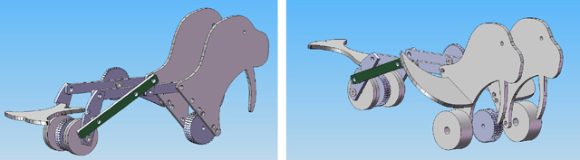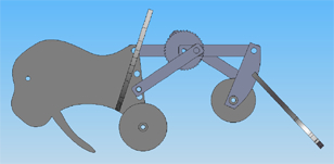 We used Solidworks to visualize and refine our movement. Once we had a working Lego prototype, we translated our model into Solidworks. In Solidworks, we found that these Lego links were in fact unstable due to unforeseen collisions with other pieces (Figure 13). By simulating the movement of each design iteration, we were able to experiment with different linkage dimensions so that we could find the smooth galumphing motion that we were looking for in a stable design (Figure 14).