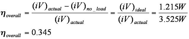 In order to determine the overall efficiency and losses in the system, we ran a comparison between no-load conditions in air and actual operating conditions on the sandy slope.  The no-load conditions in air represented the internal frictional losses to rubbing in the linkages and misalignment.  Taking the average v and i as the seal climbed the slope, we were able to identify the actual power consumed.  Subtracting the frictional no-load power consumption from the actual power, we were able to identify the ideal power consumption of the seal.  Using the following equation, we calculated the efficiency: