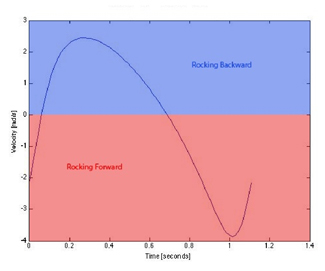 Having settled on this gear ratio, we decided to model the linkage motion.  We used Matlab to analyze whether our idea for out-of-phase linkages would trace a reasonable path and create a steady velocity without any huge velocity spikes.  In Figure 11, we traced the front and rear linkages and tweaked the lengths until the paths that they swept were large enough to ensure that the Eggman would travel up the sandy slope in under thirty seconds.  We plotted the velocity of the output of the linkage as a function of the time in one cycle (Figure 12).  We were satisfied with the resulting smooth velocity curves, which would ensure an easy galumphing motion without any velocity spikes (and therefore no abrupt force peaks).