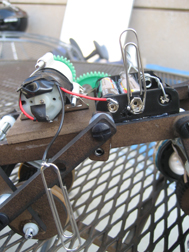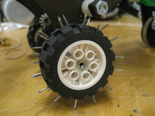 Although the ratcheting mechanism worked well, the friction between the wheels and the surface was not always large enough and the wheels sometimes slipped. We increased friction by adding rubber bands around the rear wheels, but still saw the front wheels slipping. Although we tried putting rubber bands in the front as well, we eventually transitioned to rubber Lego wheels for more consistent gripping. Finally, we found that poking nails through the rubber Lego front wheels resulted in the correct amount of grip and eliminated slippage on all wheels (Figure 6).