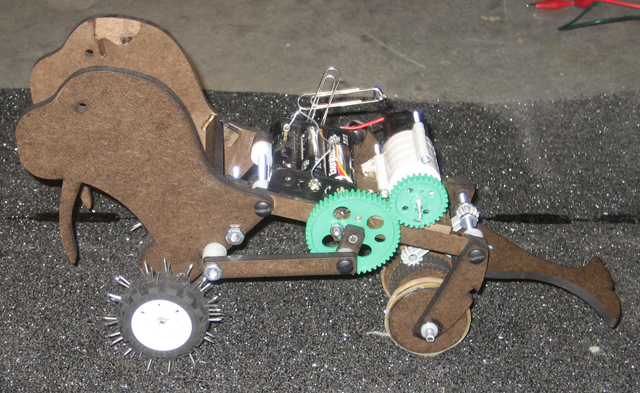 In February of 2009, our team “I am the Walrus” successfully recreated the galumphing motion of an Elephant Seal that could authentically crawl up a sandy beach for Lancaster Burton, Project Manager of ROSES. After thorough brainstorming and prototyping, we built our final design with two asynchronous four-bar masonite linkages that were 180 degrees out of phase to create a natural galumphing motion (Figure 1). One set of four-bar linkages controlled the head and another set controlled the tail, allowing the body to expand and contract much like an Elephant Seal. A Tamiya gearbox motor with a gear ratio of 167:1 powered by two AA batteries controlled the linkages.